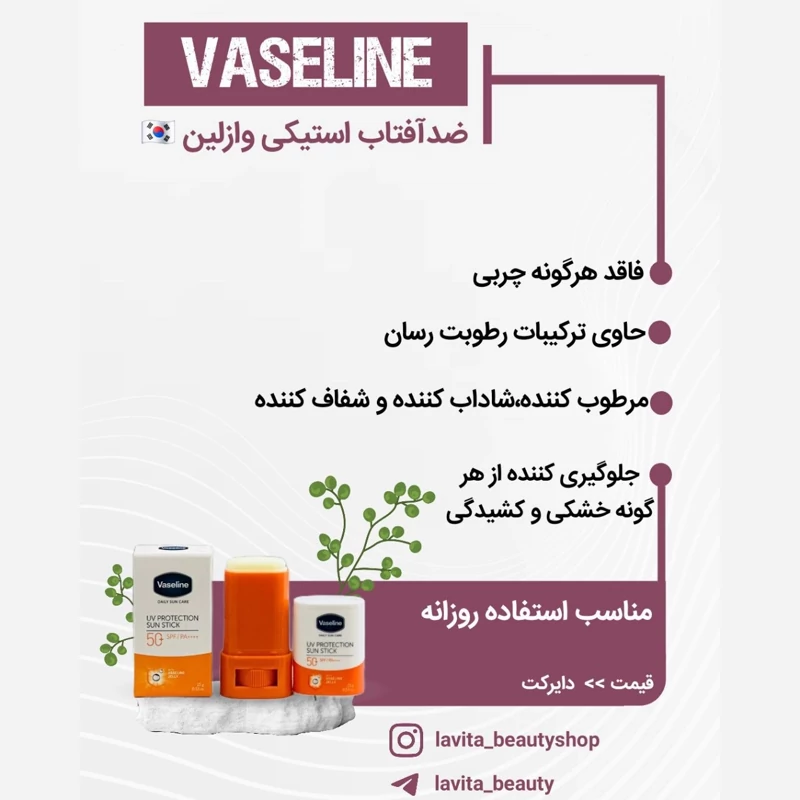 ⚜️ضد آفتاب استیکی وازلین⚜️ ✨️Vaseline UV Protection SPF 50 Sun✨️ ساخت کره جنوبی 🇰🇷 ضد آفتاب استیکی وازلین فاقد هرگونه چربی بوده و بلافاصله بر روی پوست مات می شود. ترکیبات رطوبت رسان این ضد آفتاب فورا به عمیق ترین لایه های پوست نفوذ کرده و تمام میزان رطوبت مورد نیاز پوست را تامین می کنند. همچنین با حفظ طولانی مدت رطوبت تولید شده، از هرگونه خشکی و کشیدگی پوست به مدت 24 ساعت جلوگیری می کند. • Spf 50 Pa++++ ✔️ دارای ژل وازلین برای رطوبت رسانی پوست، بدون ایجاد خشکی و کدری ✔️ مرطوب کننده، شاداب کننده و شفاف کننده پوست های تیره و کدر ✔️ محافظت از پوست در برابر اشعه های UV ✔️ فاقد چربی و بدون ایجاد حس سنگینی، رد چربی و رد سفیدی بر روی پوست #ضدآفتاب #وازلین